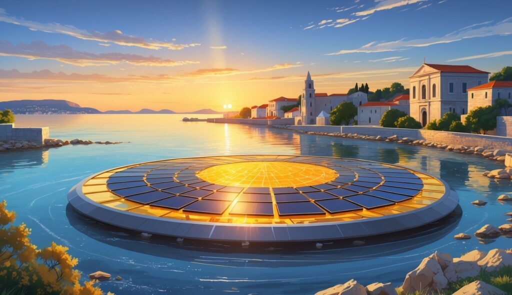 The installation also holds practical significance. It produces renewable electricity that powers part of Zadar’s waterfront lighting. Around the circular structure, smaller glass discs represent the planets of the solar system in proportional scale, linking art and science in a single spatial experience.